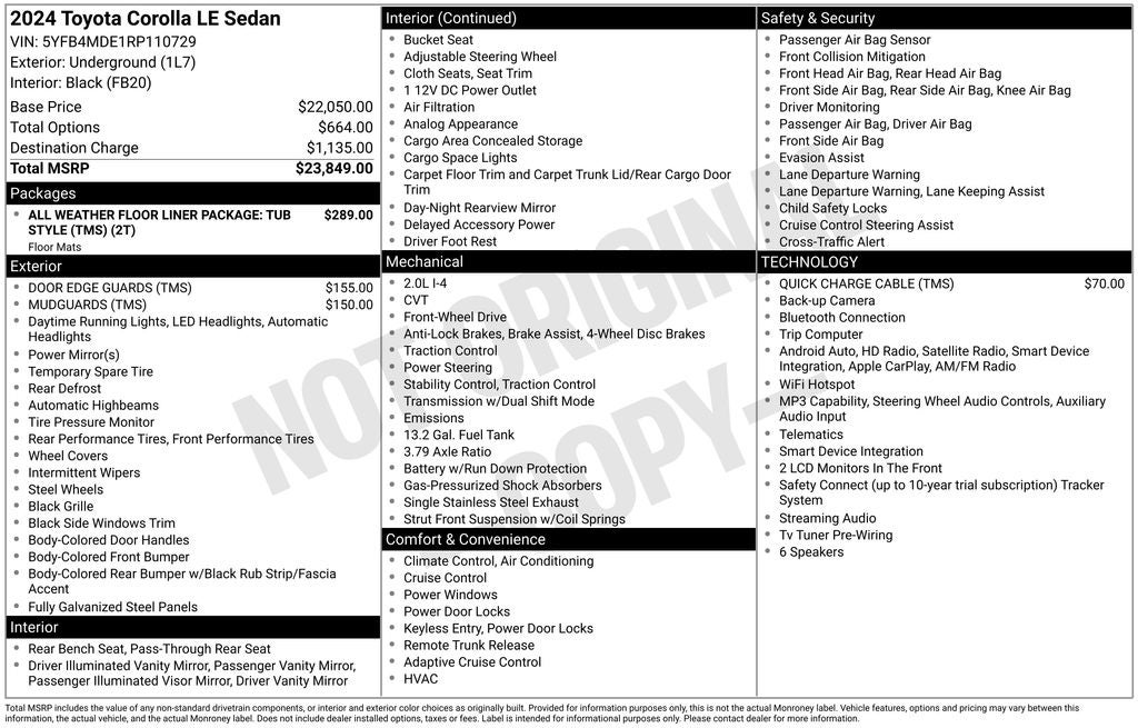 Underground LE FWD CVT 2.0L I4 DOHC 16V Back Up Camera, Bluetooth®, 16 Steel Wheels w/Covers, 4-Wheel Disc Brakes, 6 Speakers, ABS brakes, Air Conditioning, AM/FM radio: SiriusXM, Auto High-beam Headlights, Automatic temperature control, Brake assist, Dual front impact airbags, Dual front side impact airbags, Electronic Stability Control, Emergency communication system: Safety Connect (up to 10-year trial subscription), Exterior Parking Camera Rear, Front anti-roll bar, Front Center Armrest, Front wheel independent suspension, Fully automatic headlights, Knee airbag, Low tire pressure warning, Occupant sensing airbag, Overhead airbag, Panic alarm, Passenger door bin, Power door mirrors, Power steering, Power windows, Radio: 8 Toyota Audio Multimedia, Rear anti-roll bar, Rear side impact airbag, Rear window defroster, Remote keyless entry, Speed control, Split folding rear seat, Steering wheel mounted audio controls, Telescoping steering wheel, Tilt steering wheel, Traction control.