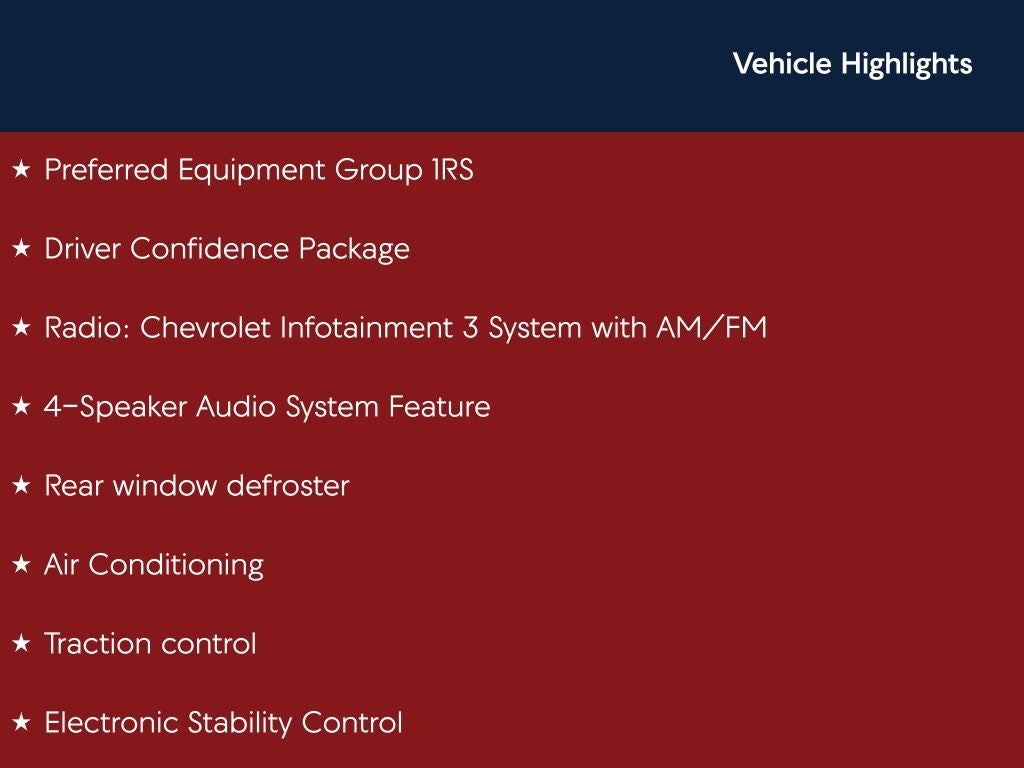 Nitro Yellow Metallic 1RS FWD 6-Speed Automatic 1.2L I3 DI Turbocharged DOHC 12V LEV3-ULEV70 137hp Back Up Camera, Bluetooth®, Clean History Report, a Clean, One Owner Carfax, 3.50 Final Drive Axle Ratio, 4-Speaker Audio System Feature, 4-Way Manual Front Passenger Seat Adjuster, 4-Wheel Disc Brakes, 6-Way Manual Driver Seat Adjuster, ABS brakes, Air Conditioning, Auto High-beam Headlights, Brake assist, Driver Confidence Package, Dual front impact airbags, Dual front side impact airbags, Electronic Stability Control, Emergency communication system: OnStar One Essentials, Exterior Parking Camera Rear, Front anti-roll bar, Front wheel independent suspension, Fully automatic headlights, Heated door mirrors, Heated Driver and Front Passenger Seats, Heated steering wheel, Lane Change Alert with Side Blind Zone Alert, Low tire pressure warning, Occupant sensing airbag, Overhead airbag, Panic alarm, Passenger door bin, Power door mirrors, Preferred Equipment Group 1RS, Radio: Chevrolet Infotainment 3 System with AM/FM, Rear Cross-Traffic Alert, Rear Park Assist, Rear window defroster, Rear window wiper, Remote keyless entry, Speed control, Split folding rear seat, Steering wheel mounted audio controls, Telescoping steering wheel, Tilt steering wheel, Traction control, Variably intermittent wipers, Wheels: 18 Black-Painted Machined Aluminum.