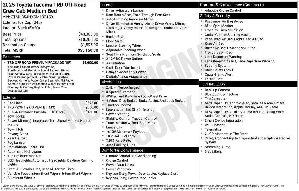 TRD Off-Road Premium Package (i-FORCE, 5ft bed) - includes SofTex(R)-trimmed seats with heated and ventilated power-adjustable front seats, leather-trimmed heated steering wheel, 14-in. Toyota Audio Multimedia display, Multi-Terrain Monitor (MTM), JBL(R) Premium Audio with JBL(R) FLEX portable speaker, moonroof, Qi-compatible wireless charging, dual zone automatic climate control, digital rearview mirror with HomeLink(R) universal transceiver, Integrated Trailer Brake Controller (ITBC), power open/close tailgate, 400W/120V AC power inverter, and power horizontal rear window