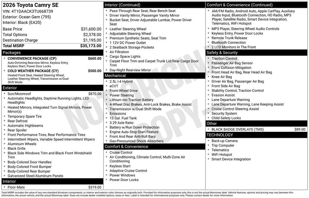 Ocean Gem SE FWD eCVT 2.5L 4-Cylinder 16V DOHC Back Up Camera, Bluetooth®, Clean History Report, a Clean, One Owner Carfax, Black w/SofTex and Fabric Seat Trim, 4-Wheel Disc Brakes, 6 Speakers, ABS brakes, AM/FM radio: SiriusXM, Apple CarPlay/Android Auto, Auto High-beam Headlights, Automatic temperature control, Brake assist, Cold Weather Package, Convenience Package, Dual front impact airbags, Dual front side impact airbags, Electronic Stability Control, Emergency communication system: Safety Connect (5-year trial), Exterior Parking Camera Rear, Four wheel independent suspension, Front anti-roll bar, Front dual zone A/C, Fully automatic headlights, Heated door mirrors, Heated Front Seats, Heated Leather Steering Wheel with Paddle Shifters, Knee airbag, Low tire pressure warning, Occupant sensing airbag, Overhead airbag, Passenger door bin, Power door mirrors, Power driver seat, Radio: 8 Toyota Audio Multimedia, Rear anti-roll bar, Rear window defroster, Security system, Smart Key System on Front Doors, Speed control, Speed-sensing steering, Split folding rear seat, Steering wheel mounted audio controls, Telescoping steering wheel, Tilt steering wheel, Traction control, Variably intermittent wipers, Wheels: 18 Multi-Spoke Black-Finished Alloy.